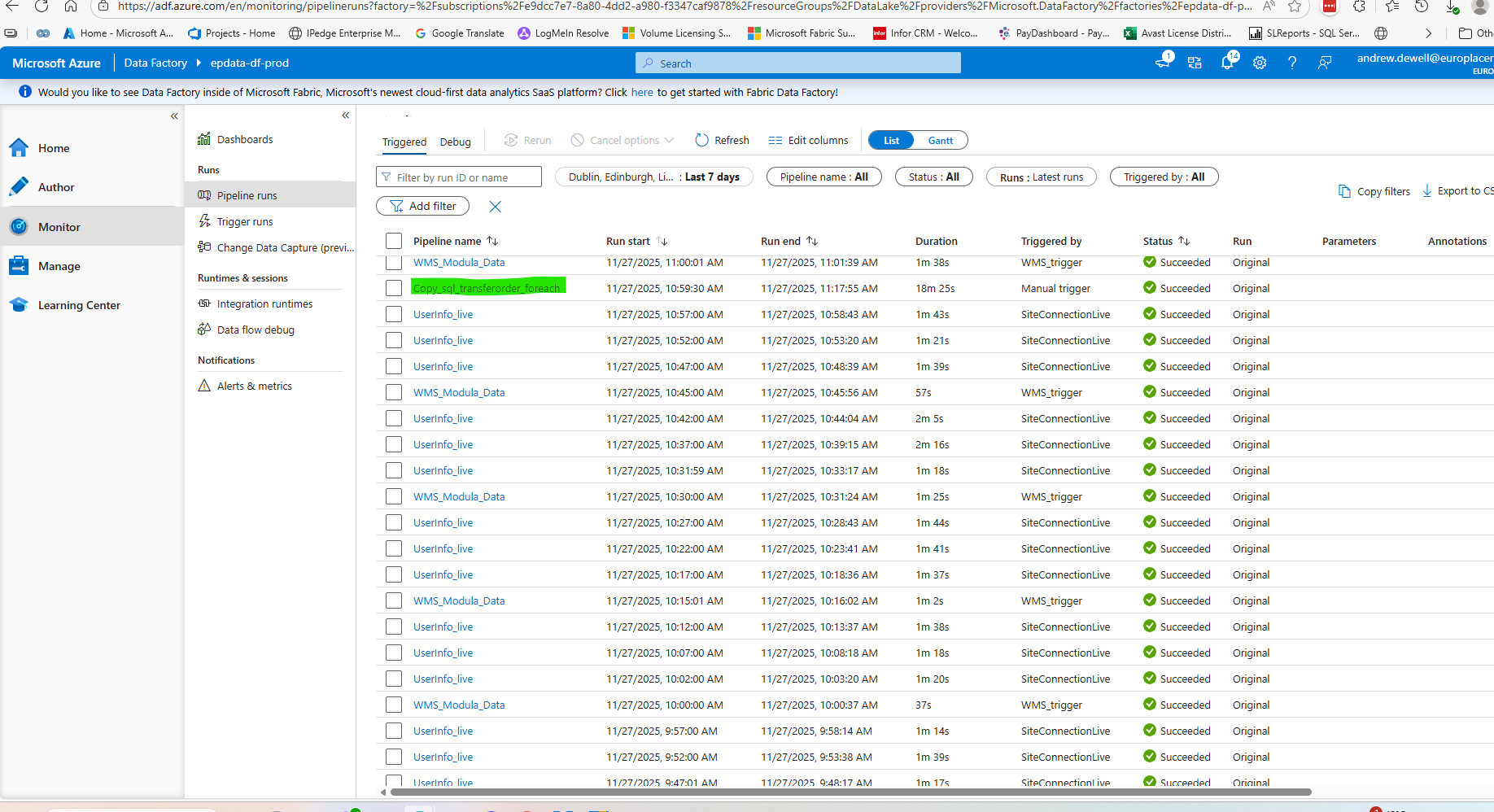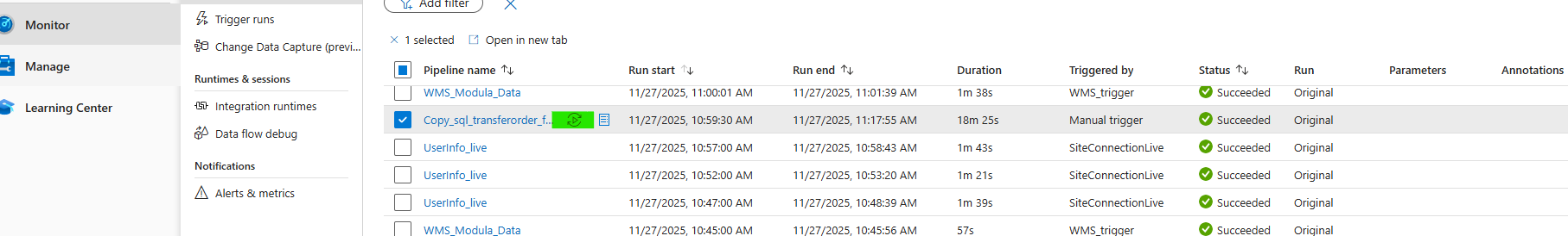 5. Go to Monitor in the table of contents and look for the 'Copy_sql_transferorder_foreach' pipeline in the list and check it has completed and the status is Succeeded. The 'Run Start' of the pipeline should be 10:05am and should be completed by 10:25