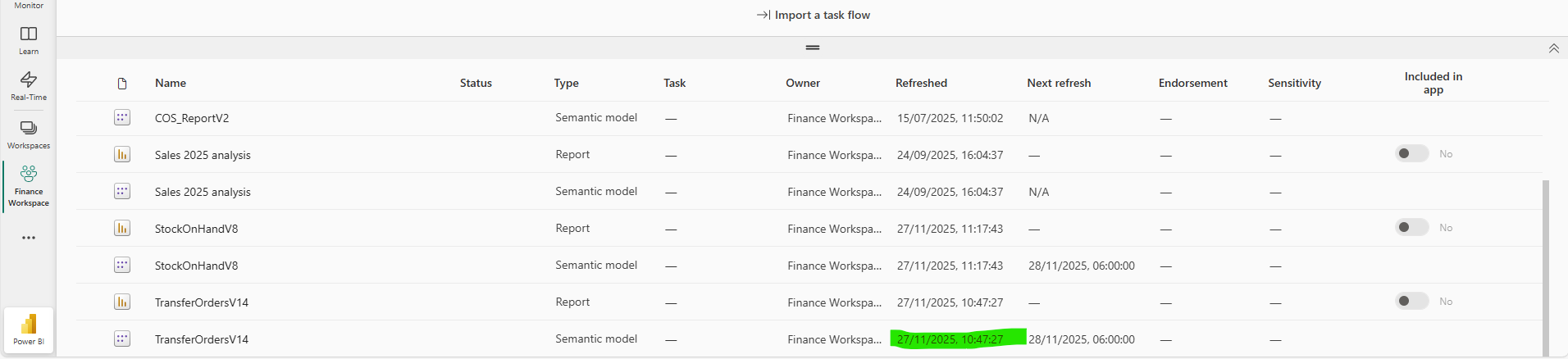 7. Once this pipeline has run and Succeeded go to Power BI, Finance Workspace and check the TransferOrdersV14 Semantic Model has refreshed, this is scheduled to refresh at 10:30 once the pipeline has updated. The refresh should be complete at approx. 10:35am