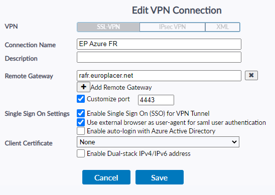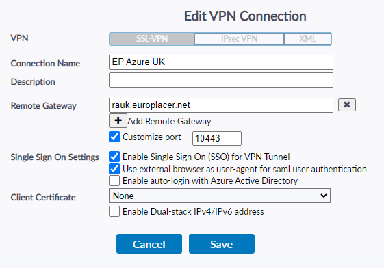 - On the user's device, set up VPN connections in Forticlient using these details: